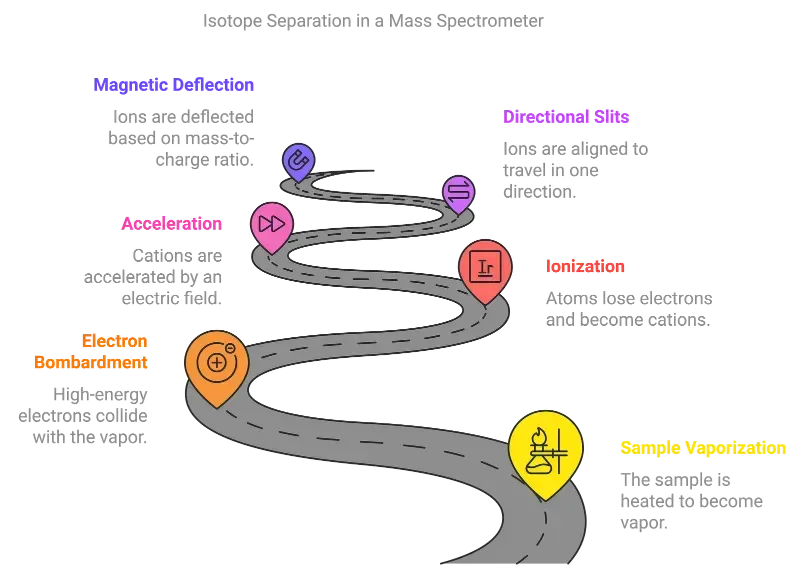 - A magnetic field deflects the accelerated cations based on their mass-to-charge ratio.